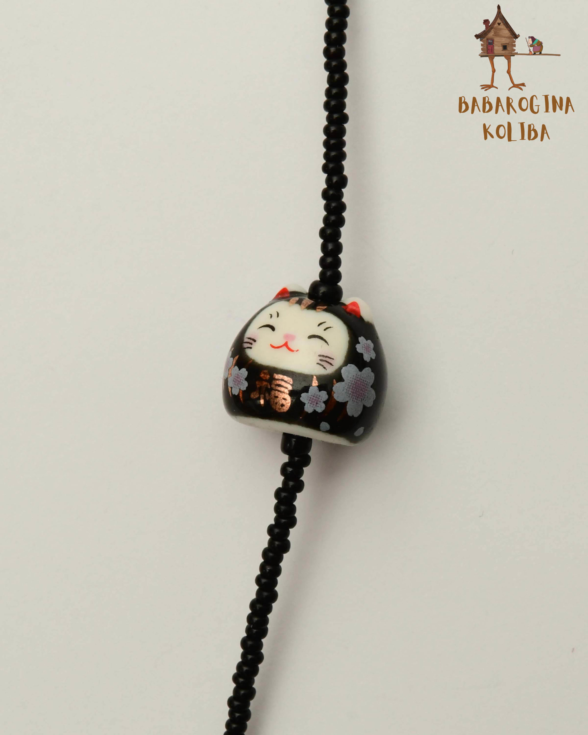 Crne sitne perlice kao elegantna baza, diskretni zlatni i crveni detalji, i nasmejana keramička maca sa zatvorenim očima, kao da prede od zadovoljstva. Cvetni motivi i nežni zlatni akcenti daju mu poseban šarm i blagu orijentalnu notu.