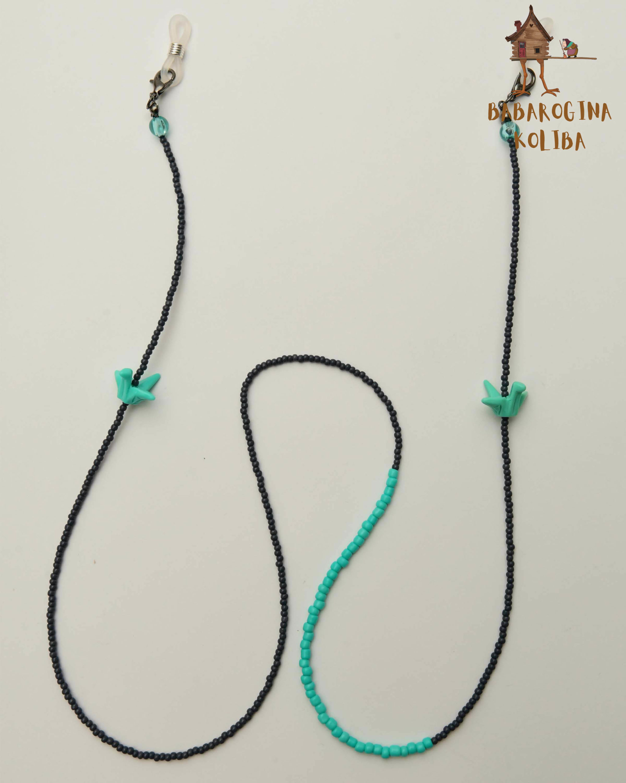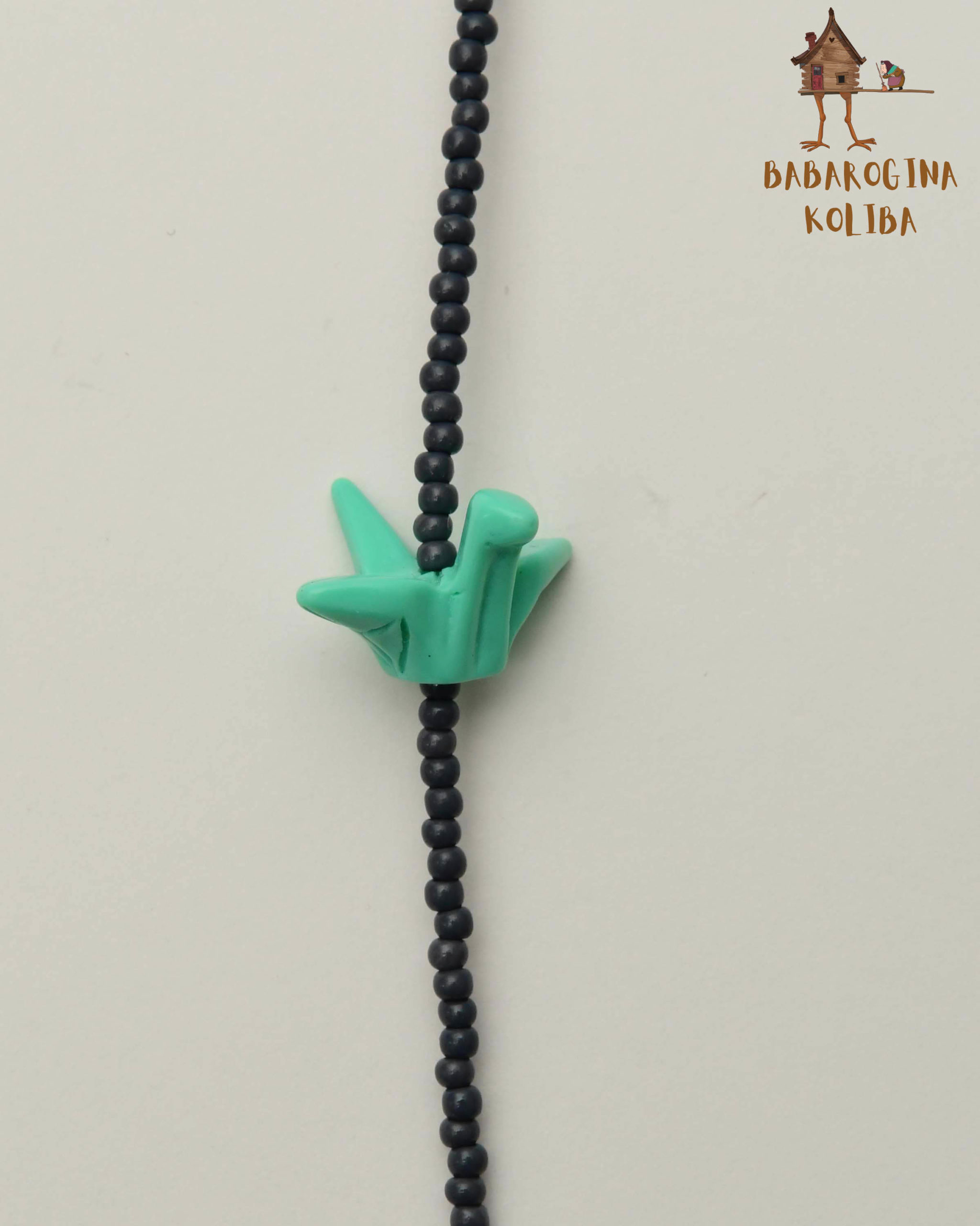 Crne i tirkizne staklene perlice i plastični origami ždral privezci u tirkiznoj boji.