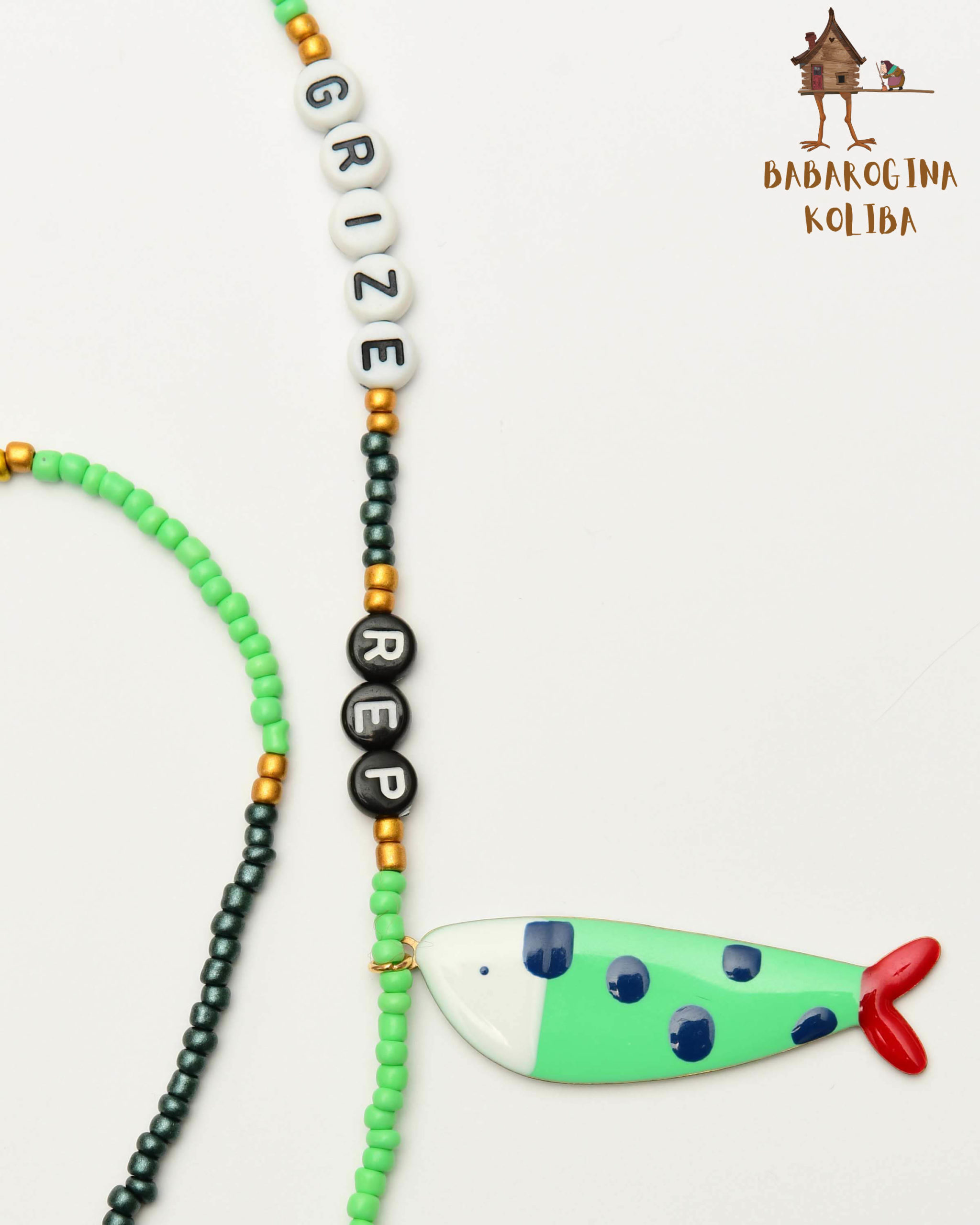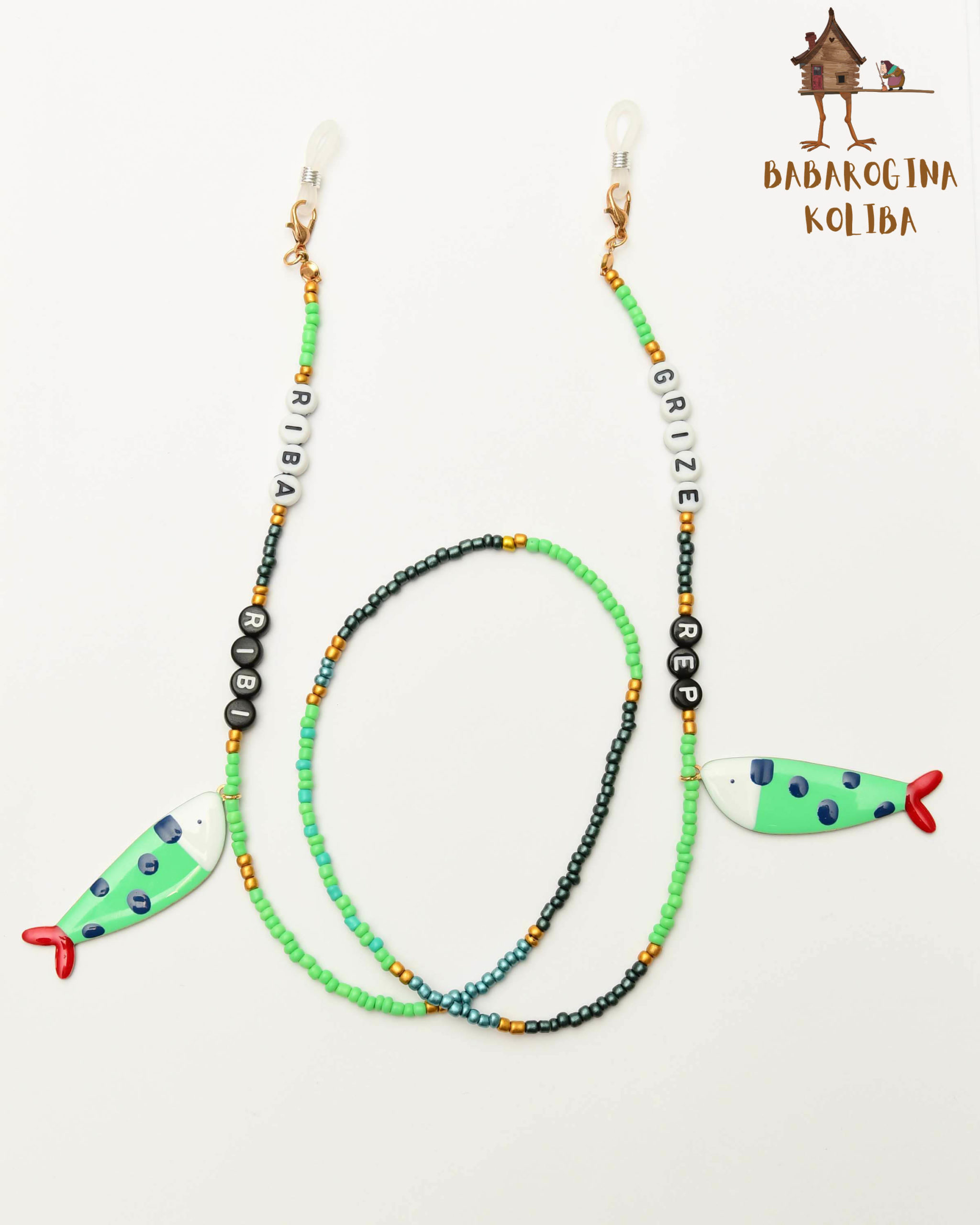 Ručni rad, nanizan od staklenih perlica u zelenim i tamnim tonovima, uz zlatne metalne perlice i ribice. Lagane i prijatne za nošenje, a završeci su gumeni držači sa metalnim kopčama – da naočare ostanu tu gde treba.